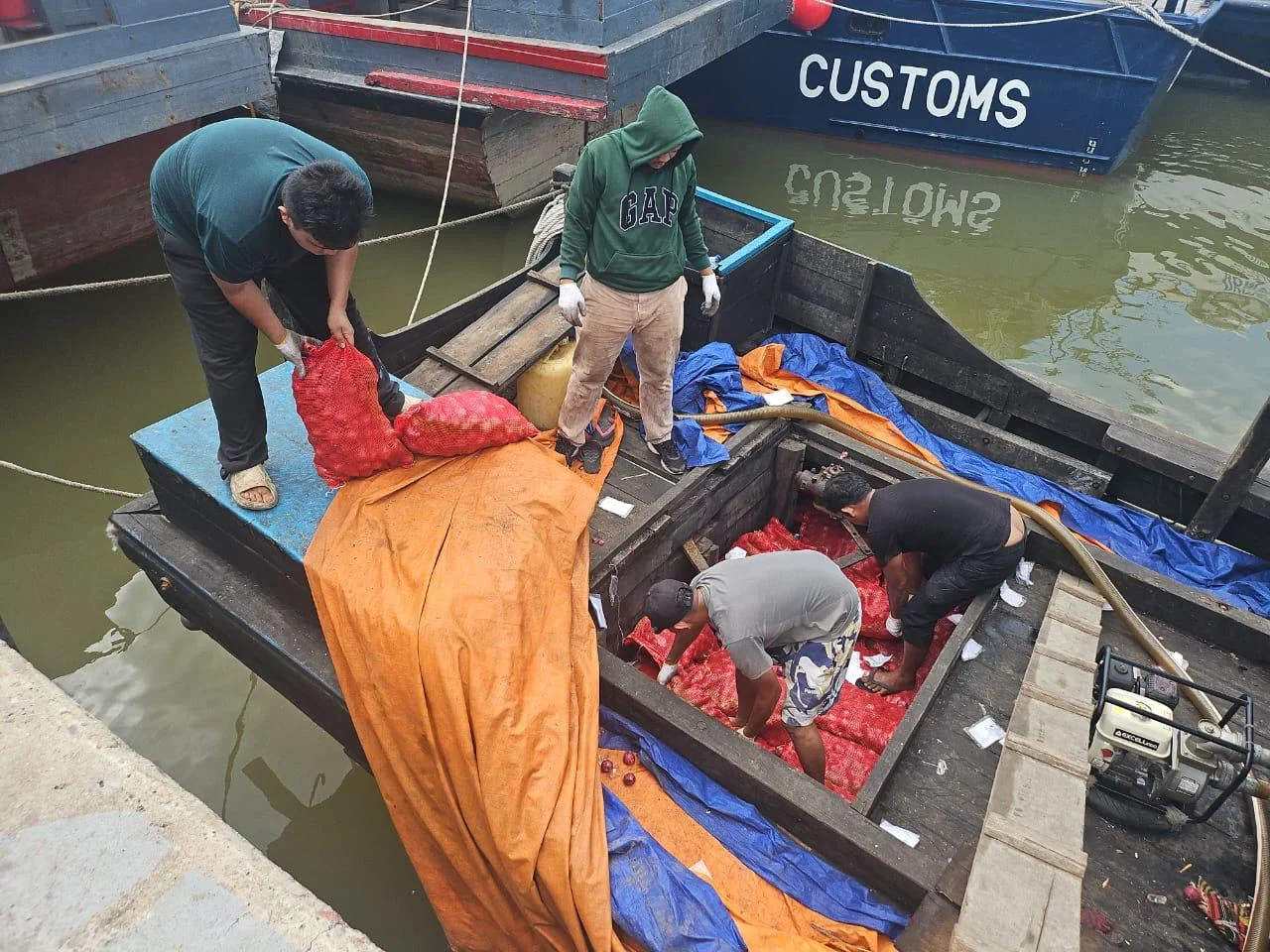 Tim telah melakukan penindakan terhadap 1 (satu) unit sarana pengangkut KM. ALFATIHAH yang kedapatan membawa 2.500 bags berisi bawang ilegal dari Kuala Linggi (Malaysia) menuju Dumai (Indonesia).