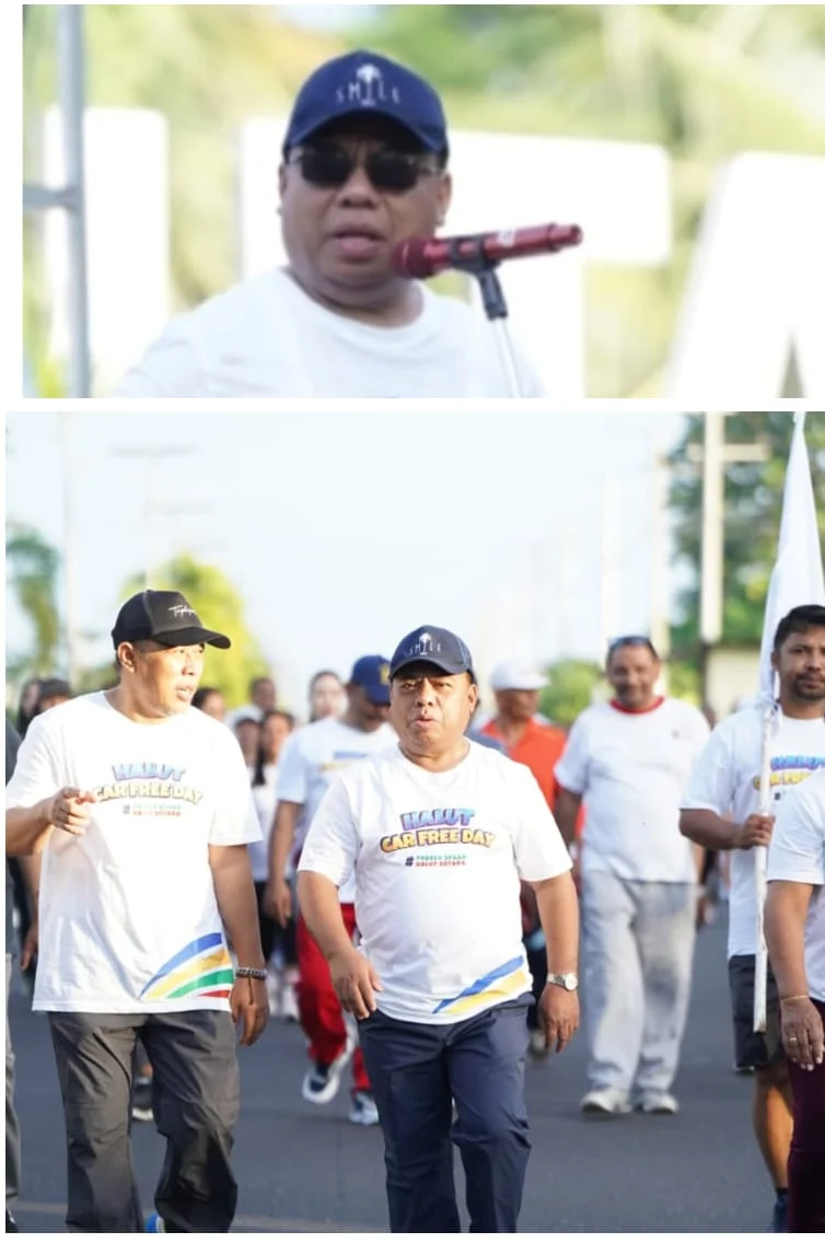 Potretone.com, Halut,- Suasana akhir pekan di pusat pemerintahan Kabupaten Halmahera Utara tampak semarak dan penuh keceriaan. Bupati Halut Piet Hein Babua bersama jajaran Forum Koordinasi Pimpinan Daerah (Forkopimda) turut meramaikan kegiatan Car Free Day yang diselenggarakan oleh Komite Olahraga Masyarakat Indonesia (KORMI) Halut, Sabtu (20/12/2025).