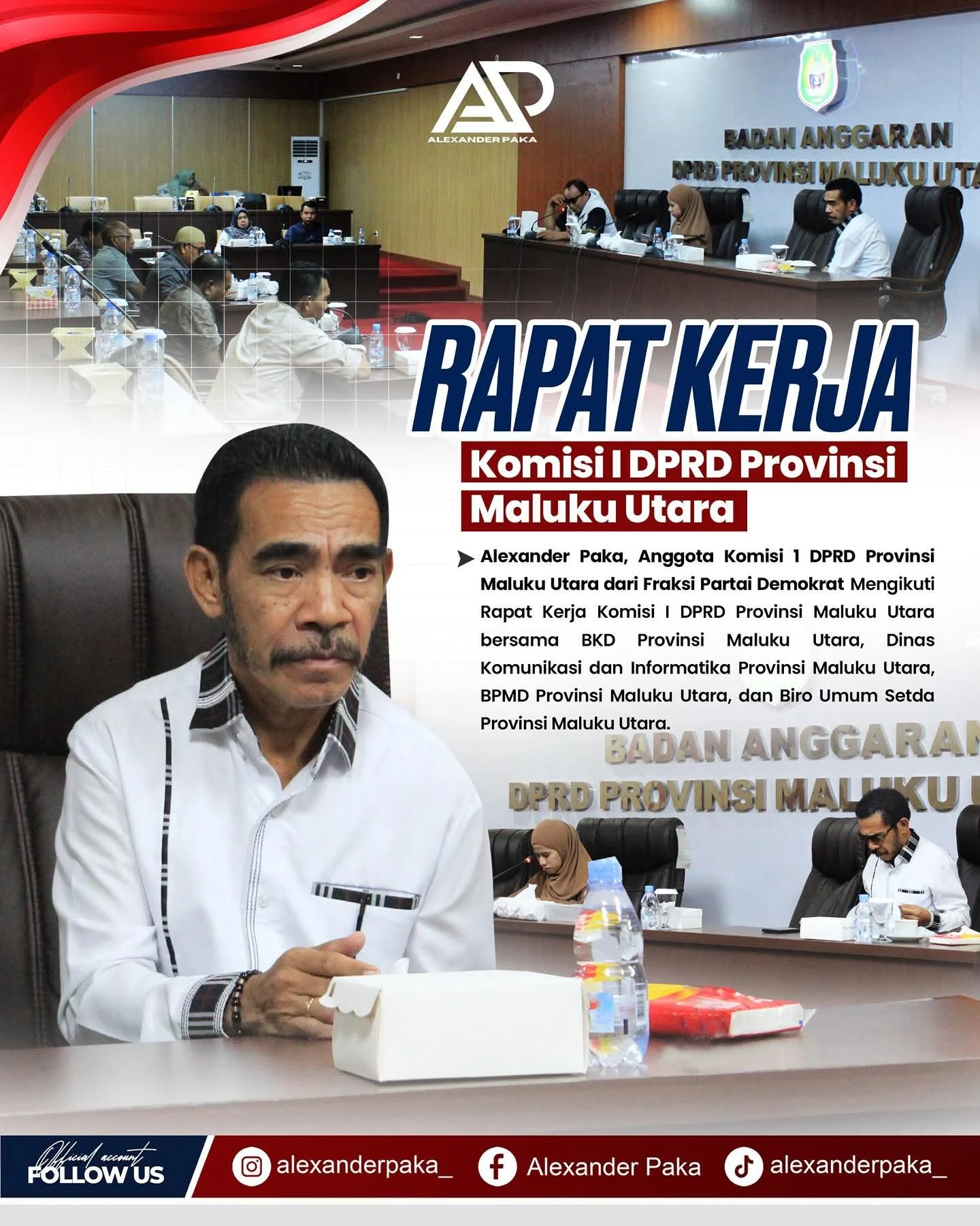 Potretone.com, Ternate,- Alexander Paka, Anggota Komisi I DPRD Provinsi Maluku Utara dari Fraksi Partai Demokrat, menghadiri rapat kerja bersama sejumlah instansi pemerintah daerah di tingkat provinsi. Senin (8/9/25).