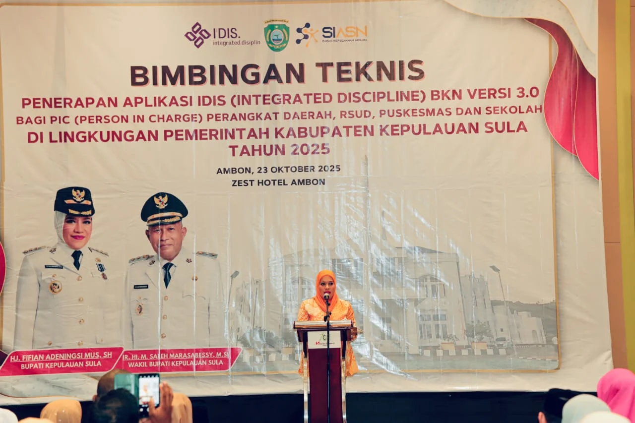 Kota Ambon, Potretone.com,- Bupati Kepulauan Sula, Hj. Fifian Adeningsi Mus, secara resmi menutup kegiatan Bimbingan Teknis (Bimtek) Aplikasi iDIS (Integrated Discipline) 3.0, yang diselenggarakan oleh Badan Kepegawaian dan Pengembangan Sumber Daya Manusia (BKPSDM) Kabupaten Kepulauan Sula bekerja sama dengan Badan Kepegawaian Negara (BKN). Sabtu, (25/10).