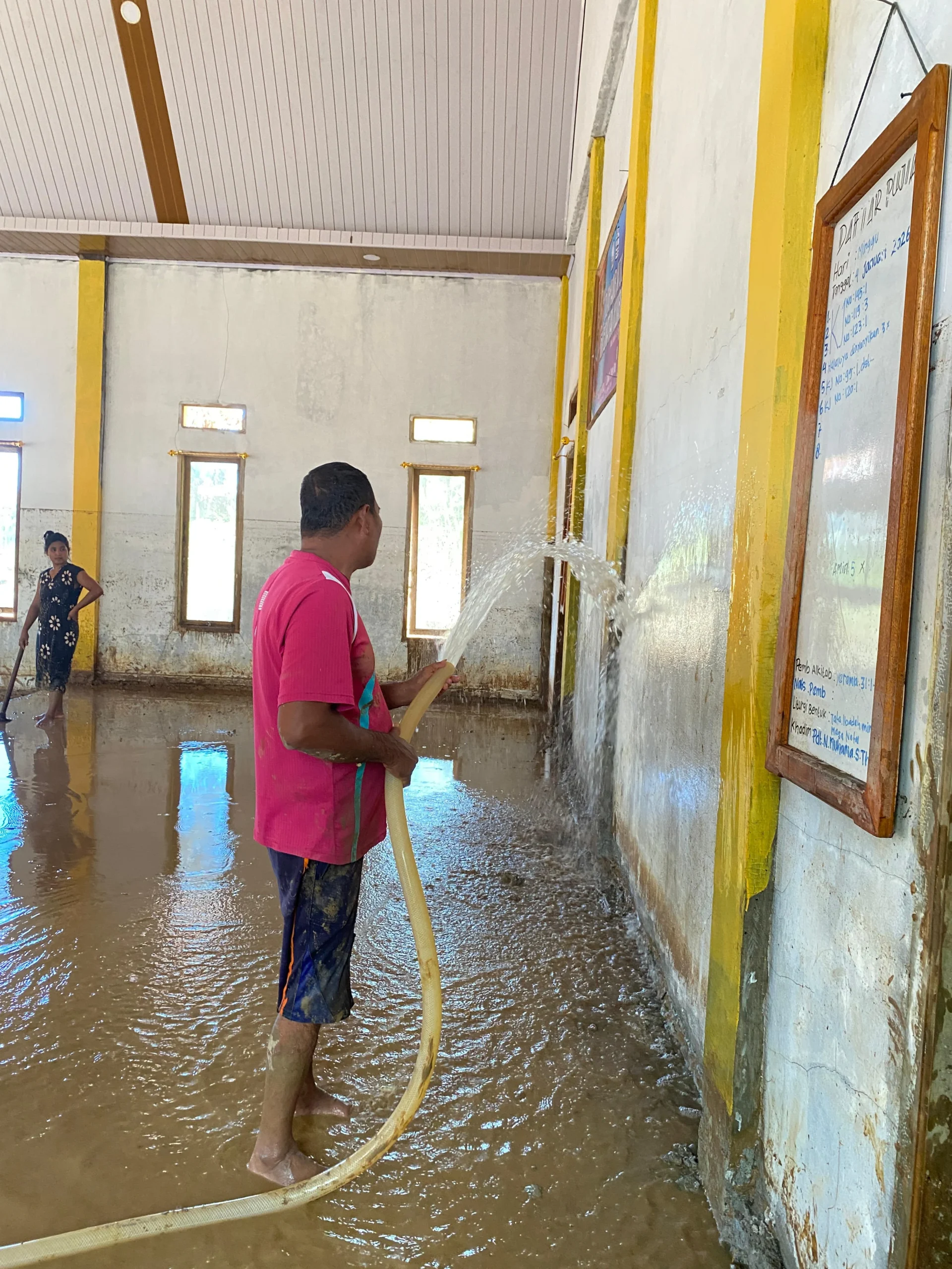 Dengan peralatan seadanya, mereka menyapu, mengangkut lumpur, mencuci dinding, serta merapikan kembali ruangan ibadah yang sempat terdampak cukup parah akibat bencana.