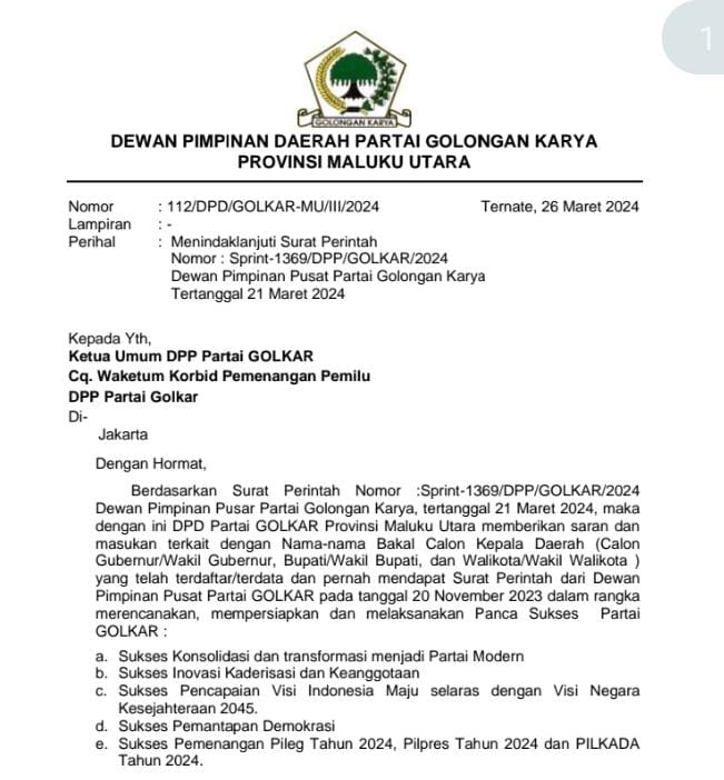 Surat DPD Partai Golkar Maluku Utara itu di tandatangai oleh Alien Mus dan Arifin Jafar masing masing sebagai Ketua dan sekretaris. Surat tersebut dilayangkan berdasarkan pada surat perintah DPP partai golkar tertanggal 21 maret 2024 dengan nomor : Sprint-1369/DPP/GOLKAR/2024.