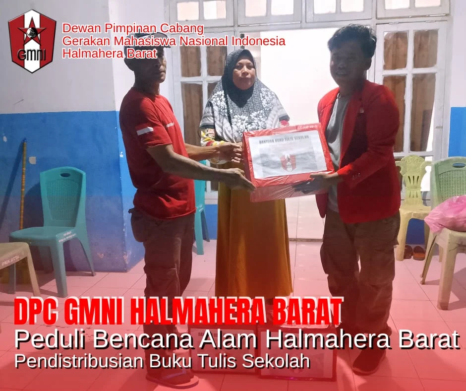PotretOne.com, Halbar,- Gerakan Mahasiswa Nasional Indonesia (GMNI) Cabang Halmahera Barat menyalurkan bantuan berupa buku tulis sekolah kepada anak-anak yang terdampak bencana alam di sejumlah wilayah Kabupaten Halmahera Barat, Maluku Utara.