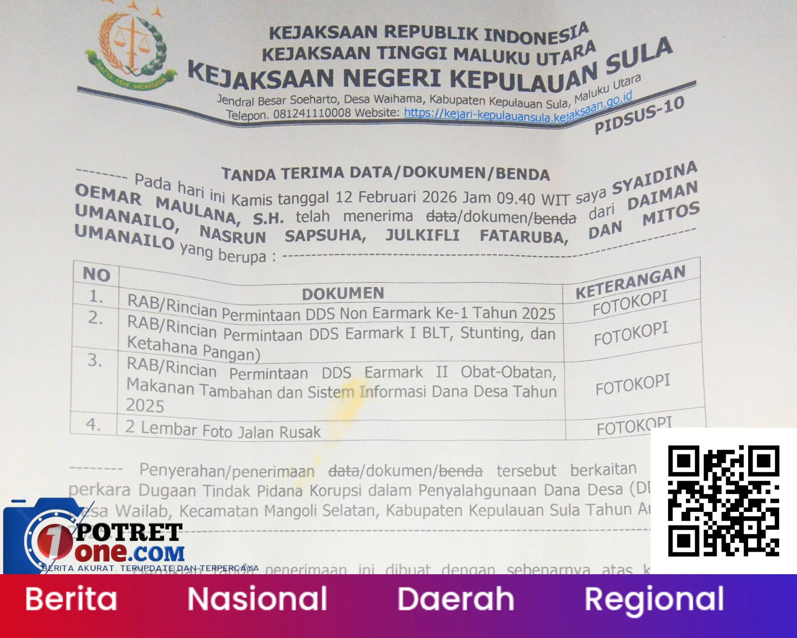 Potretone.com, Sanana,- Kejaksaan Negeri Kepulauan Sula resmi menerima laporan warga terkait dugaan penyalahgunaan Dana Desa (DD) tahun anggaran 2025 di Desa Wailab, Kecamatan Mangoli Selatan, Kabupaten Kepulauan Sula.