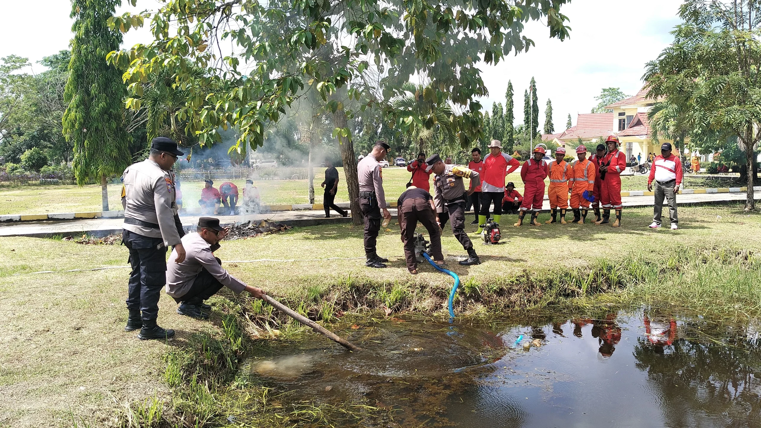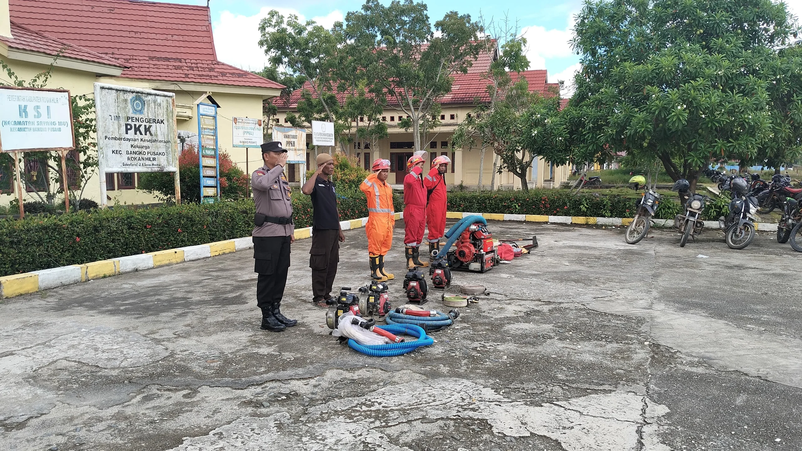 Pada kesempatan ini juga dilakukan pengecekan seluruh peralatan berupa mesin dan selang, lalu dilanjutkan dengan kegiatan simulasi pemadaman kebakaran di halaman Kantor Camat Bangko Pusako.