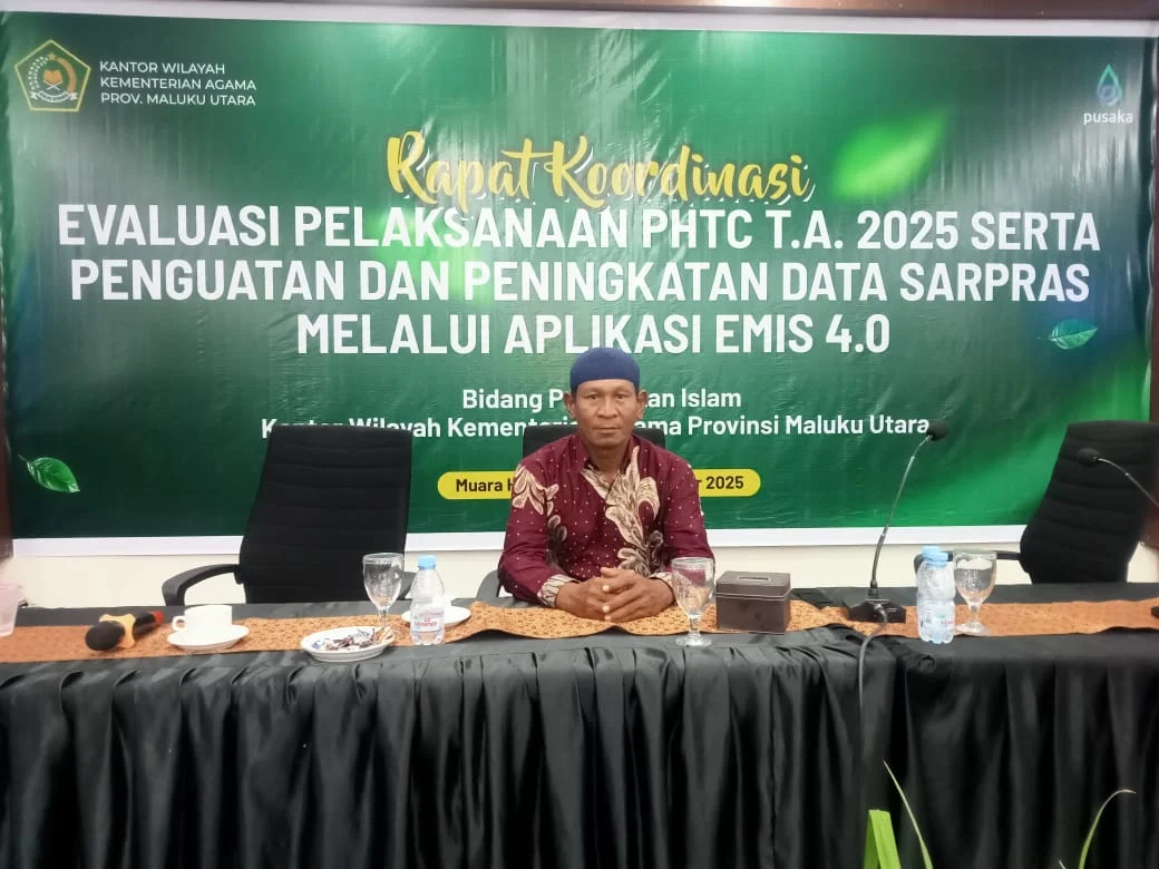 Ternate, Ptretone.com,- Kepala Madrasah Tsanawiyah Negeri (MTsN) 2 Kepulauan Sula, Muchlis Sibela S.Pd, menghadiri Rapat Koordinasi “Evaluasi Pelaksanaan PHTC T.A. 2025 serta Penguatan dan Peningkatan Data Sarpras Melalui Aplikasi EMIS 4.0” yang diselenggarakan oleh Bidang Pendidikan Islam Kantor Wilayah Kementerian Agama Provinsi Maluku Utara yang berlangsung di ruang Aula Muara Hotel. Sabtu, (25/10/25).