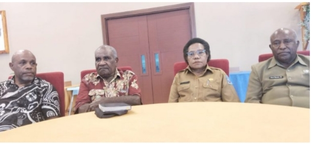 Potretone.com Papua – Ketua Panitia HUT PI, Delila Giay Di dampingi penggagas HUT PI, Derek Timotius dan Narasumber sejarahwan PI, lembah grime Nawa Jhon Lensru dengan wakil sekretaris HUT PI Yehuda Hamokwarong, Selasa 23/4/2024.