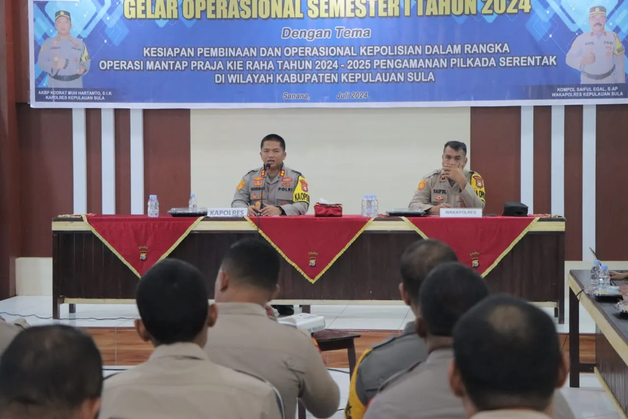 Kepolisian Resor Sula, menggelar Operasional Semester I Tahun 2024 dengan tema “Kesiapan Pembinaan dan Operasional Kepolisian dalam Rangka Operasi Mantap Praja Kie Raha Tahun 2024-2025.”