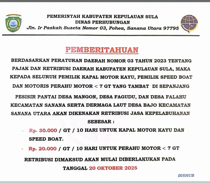 Dalam kebijakan tersebut, mulai 20 Oktober 2025, seluruh pemilik kapal motor kayu, speed boat, dan perahu motor dengan ukuran di bawah 7 GT yang beroperasi atau tambat di sepanjang pesisir pantai Desa Mangon, Desa Fagudu, dan Desa Falahu (Kecamatan Sanana), serta Dermaga Laut Desa Bajo (Kecamatan Sanana Utara) akan dikenakan tarif retribusi sebagai berikut: