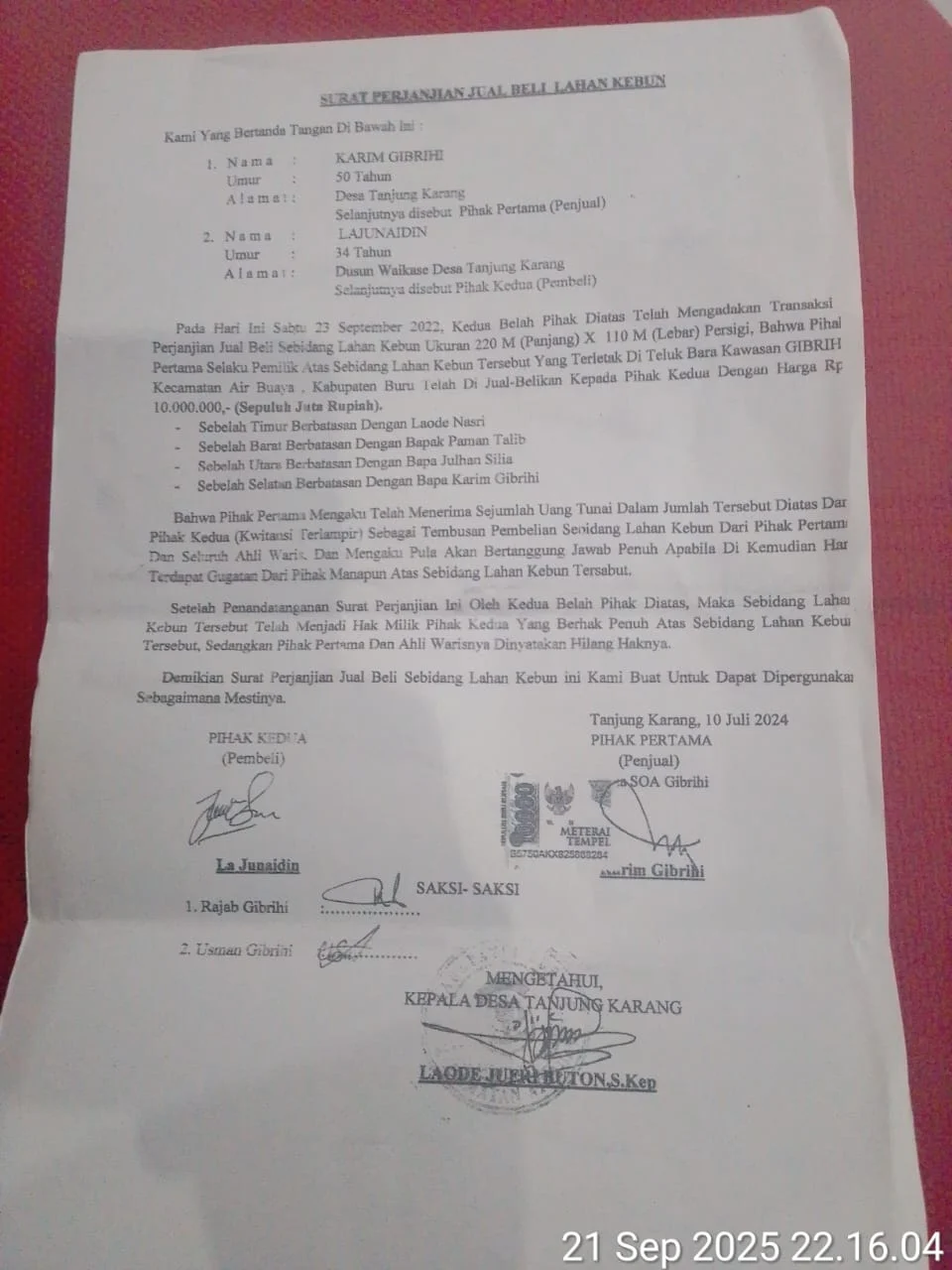 Potretone.com Buru, Maluku,- Polemik terjadi di Kabupaten Buru, Provinsi Maluku, setelah Kepala Desa Tanjung Karang, La Ode Jufri Buton, S.Kep, diduga melakukan pengesahan surat jual beli tanah yang berada di wilayah Desa Bara. Tindakan ini menimbulkan keresahan di kalangan masyarakat Desa Bara serta memicu perdebatan soal batas kewenangan administratif antar desa. Senin, (29/9/25).