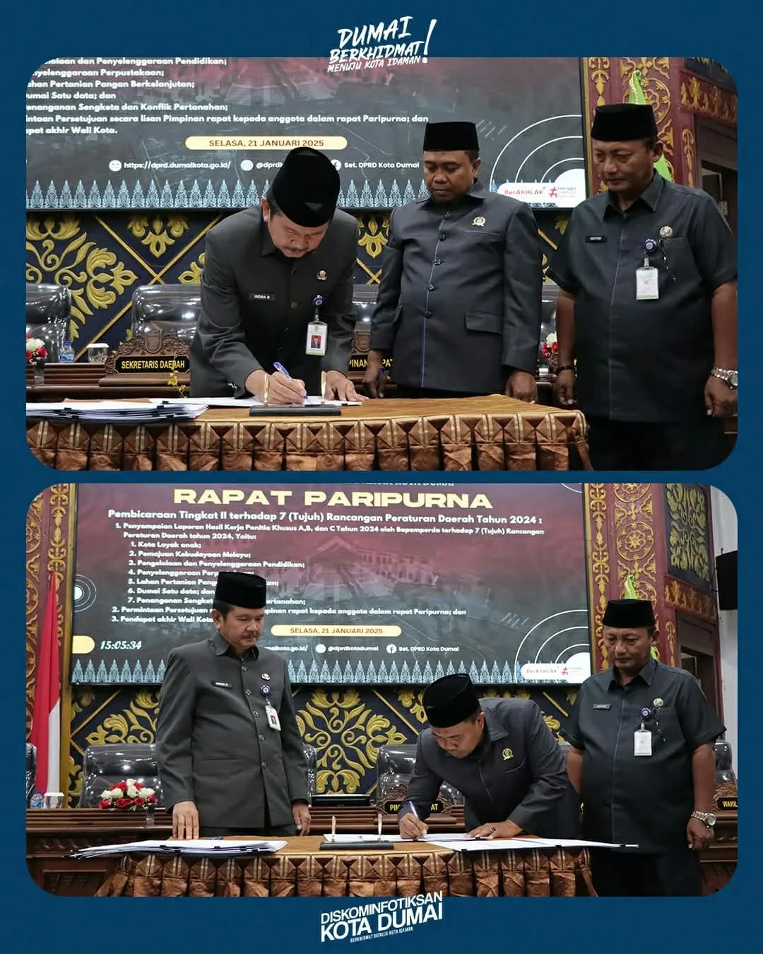 Acara berikutnya, Sekdako Dumai bersama Ketua DPRD Kota Dumai menandatangani Persetujuan Bersama antara Pemerintah Kota Dumai dengan DPRD Kota Dumai terhadap Rancangan Peraturan Daerah Kota Dumai yang telah disetujui tersebut.